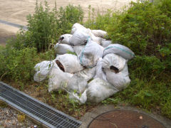 土嚢?と思ったら、葉っぱとか土を詰め込んだものだそうです。それを上から投げている人に指示を出していたのは、ちょうど図書室前のその中庭に立っていたおじさんだったのですが、そのおじさんが答えてくれました。これ、全部屋上の排水溝付近に積もっていたゴミの山なのだそうです…。何でもこの建物、5年前に改修したあと、まだ一度も屋上掃除をしたことがなかったそうで。えええ。掃除してなかったの!?それでこのゴミ袋の山!?なお、ゴミ袋は全部で30個になったそうです…。どこから飛んできたー、頑張りすぎだよ、泥と葉っぱ。